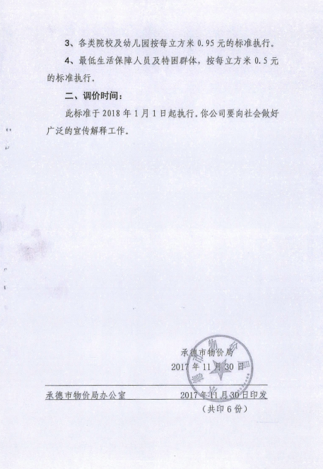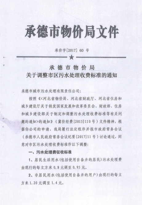 《承德市物價局關(guān)于調(diào)整市區(qū)污水處理收費(fèi)標(biāo)準(zhǔn)的通知》承價字【2017】60號